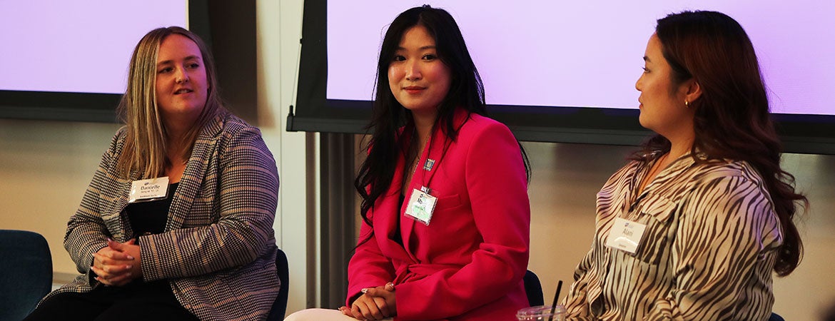 Header image: Danielle Wright '17, '21 MBA (Goldman Sachs), Alani Tong (Deloitte), and Mindy Pham-Bui '21 (EY), panelists at a finance session